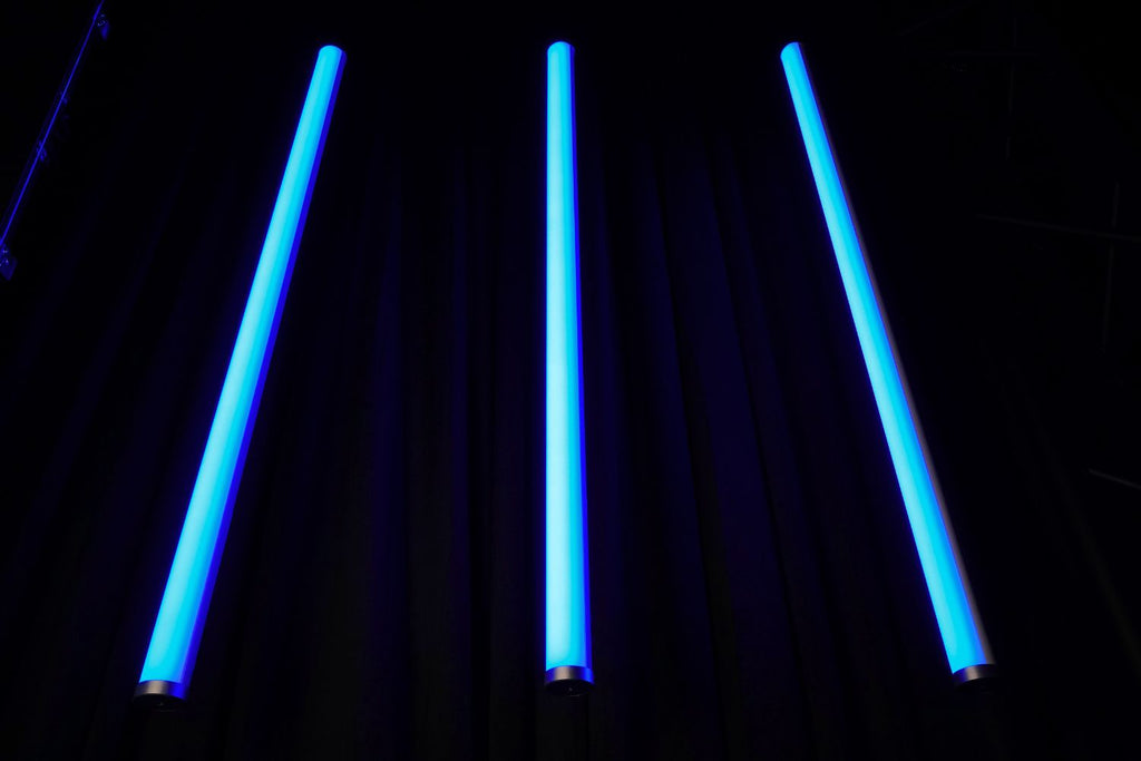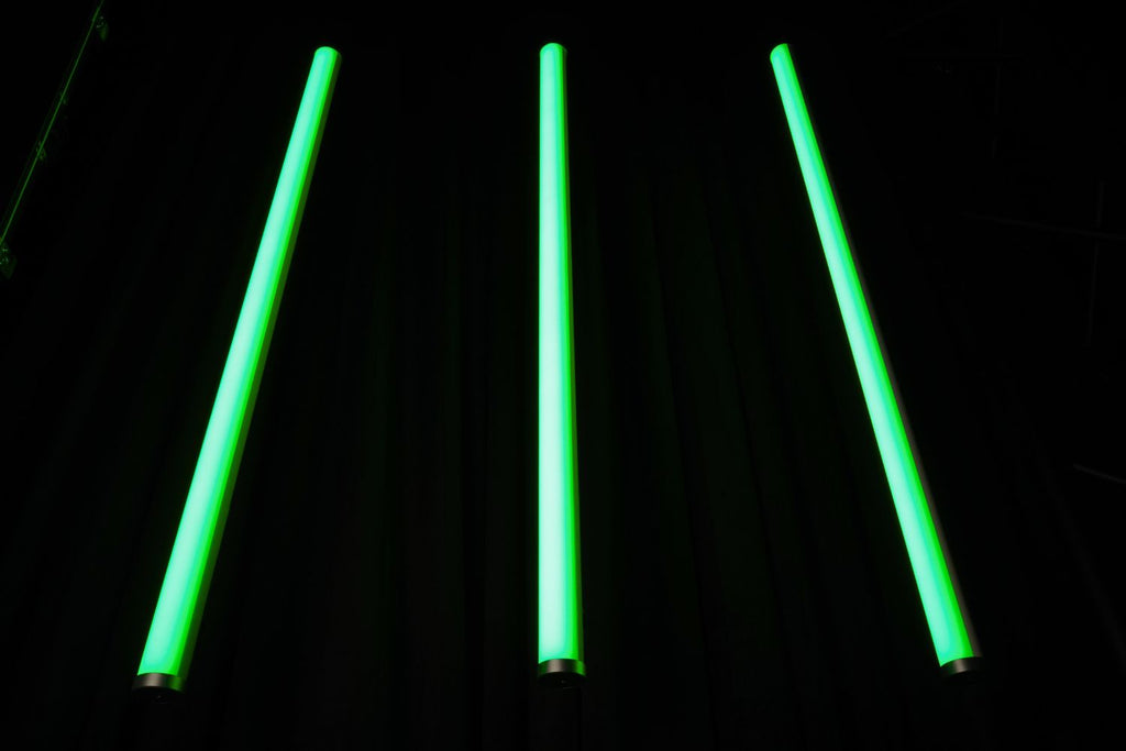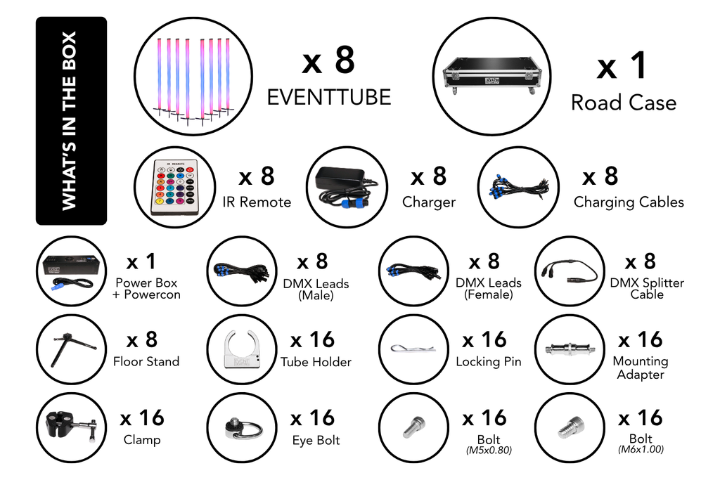 The Event Lighting EVENTTUBEKIT packs 8 battery-powered IP65 RGBW LED tubes into a rugged road case, engineered for film sets, festivals, and live events. Each tube commands 288 individual LEDs with 32-segment pixel mapping—push creative boundaries with intricate color sequences and dynamic effects. Control via DMX512, wireless DMX, mobile app, or IR remote. Run up to 20 hours per charge. The complete kit includes charging station, cables, remotes, and a full rigging arsenal: 16 clamps, 16 holders, floor stands, and mounting plates. Grab it, deploy it, own the space.